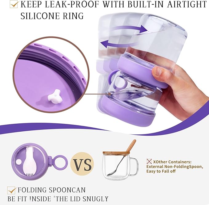 Container Food Overnight Oats Containers with Lids, Folding Spoons 26 oz Plastic Mason Jars Containers with Lids Portable Cereal and Milk Container on The Go (purple Oatmeal Cup)