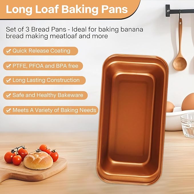 3-Pack 9x5 Loaf Pan for Baking Bread, Nonstick Bread Pan With Copper & Black Two-Tone Finish Perfect for Homemade Bread, Meatloaf, Pound Cake