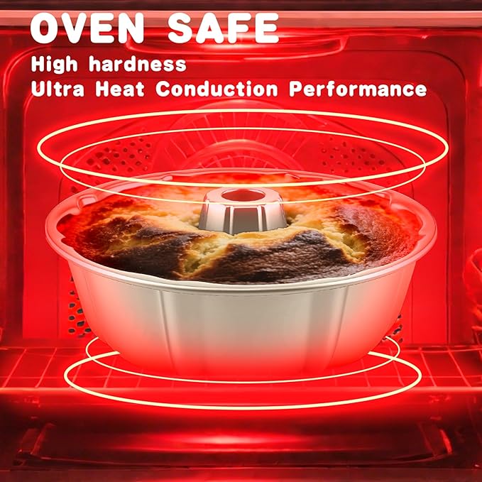 - Standard Size- The bundt cake pan features a 9.5” diameter and a 2.95” height, making it perfect for sharing with friends and families. The pound cake pan is suitable for most ovens. With its narrow base, straight sides, and extra-large center tube, this bundt pan non stick is a must-have kitchen essential, also a fantastic addition to any kitchen.