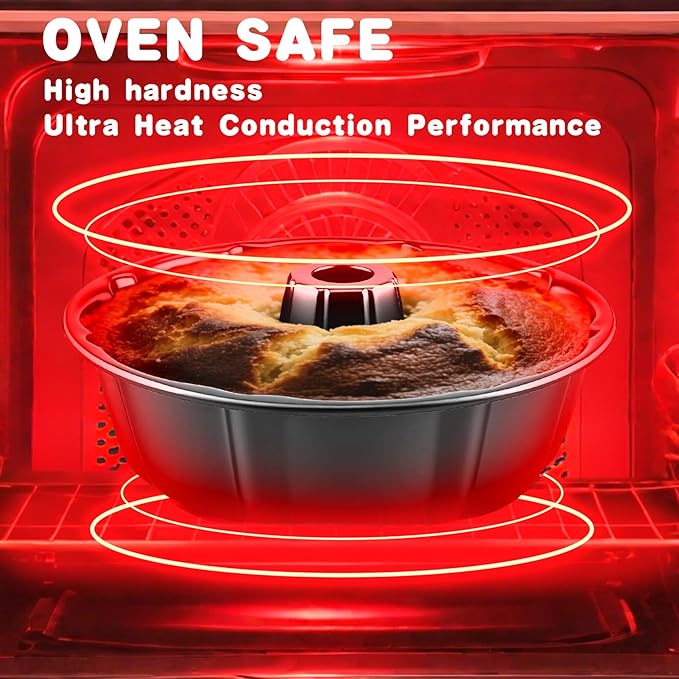- Standard Size- The bundt cake pan features a 9.5” diameter and a 2.95” height, making it perfect for sharing with friends and families. The pound cake pan is suitable for most ovens. With its narrow base, straight sides, and extra-large center tube, this bundt pan non stick is a must-have kitchen essential, also a fantastic addition to any kitchen.