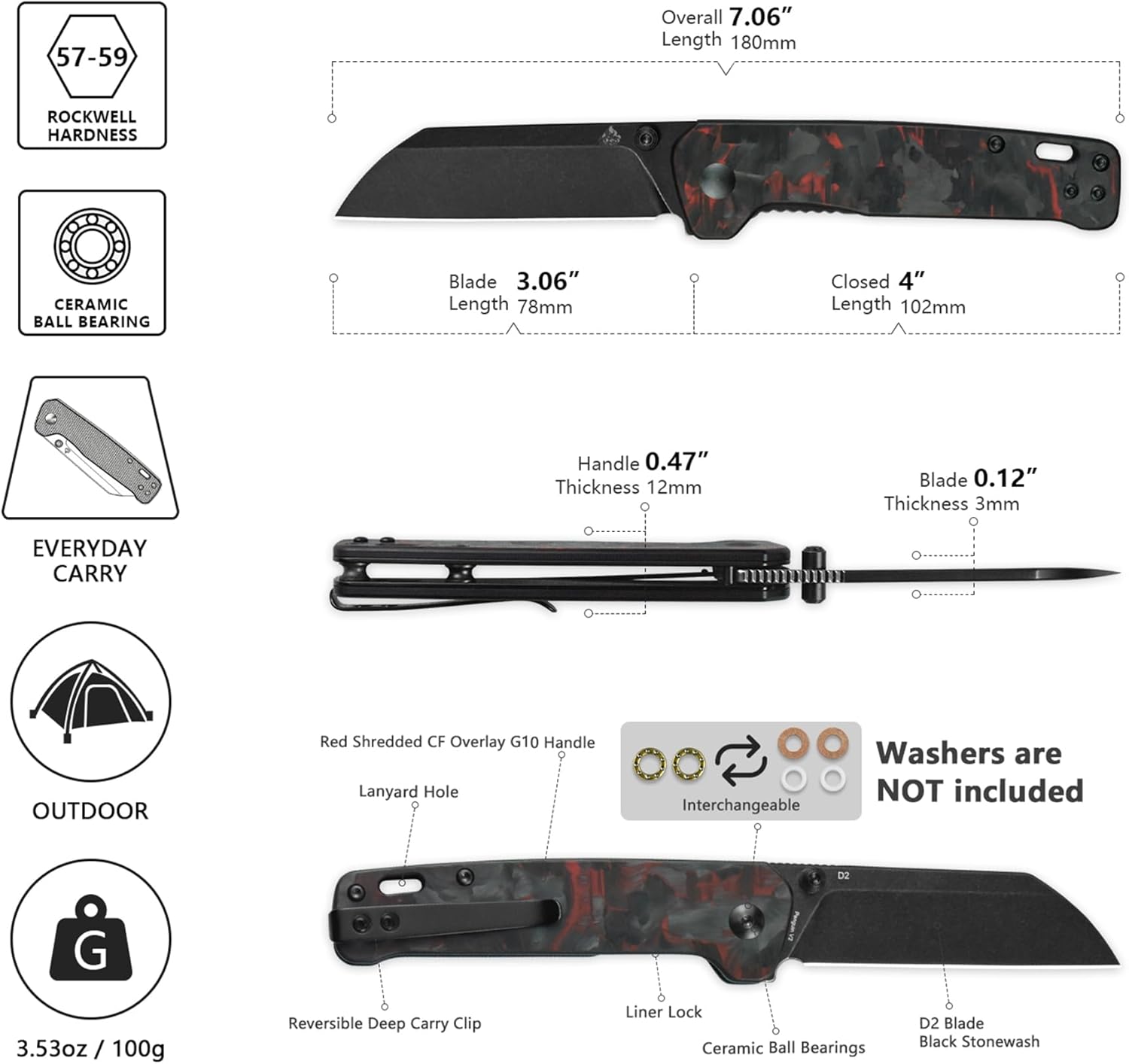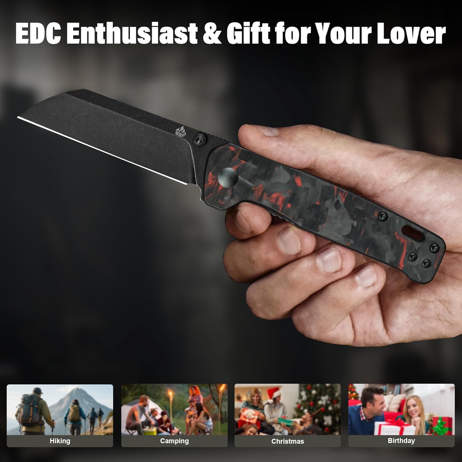 QSP Penguin V2 Folding Pocket Knife, 3.06" D2 Black Stonewash Blade EDC Knife, Red Shredded CF Overlay G10 Handle, Liner Lock, Ceramic Ball Bearings, Reversible SS Deep Carry Clip