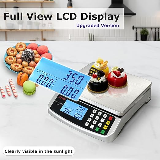 - Upgrade Full View LCD Display: High-quality, backlit LCD screen readable from all angles, even in low-light conditions. Shows weight, unit, unit price, and total price (in price-computing mode). Designed for easy reading even in bright sunlight. Powerful functions: Pricing / Tare / Counting / PCS /CLR / Auto-off etc..
