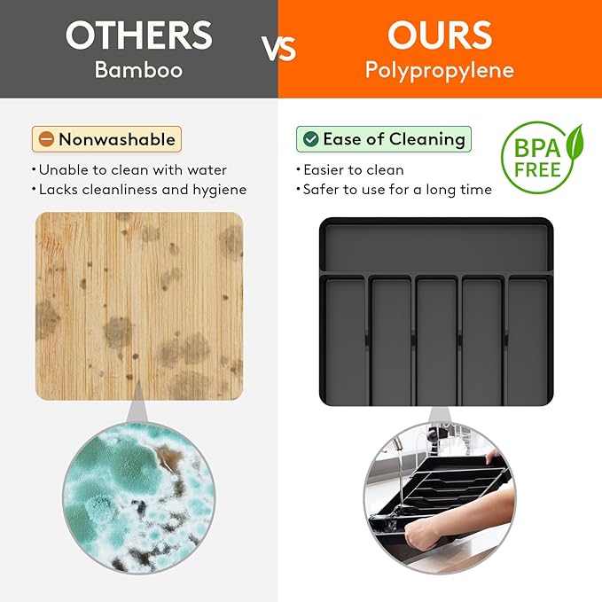 - Premium Material: Made of thick and sturdy premium PP material, the cutlery organizer is BPA free so you can rest assured that it is safe to use with all forms of tableware. The durable construction means it is built to last for a long time