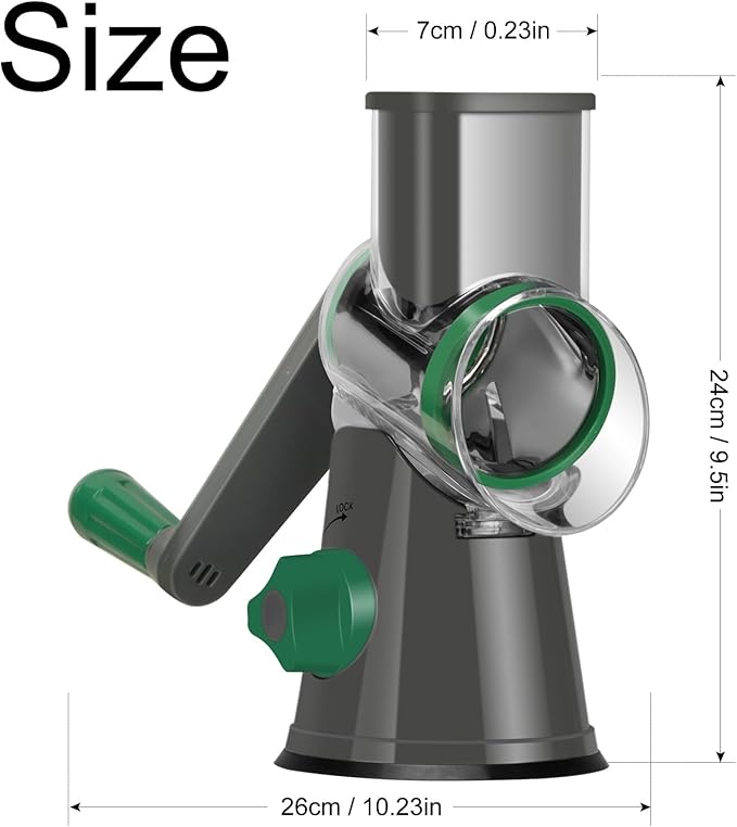 - Three blades for various kitchen needs: slicing, coarse shredding and fine shredding. The rotary grater is ideal for grating cheese, potato, carrot, cucumber, radish, nuts, chocolate, broccoli, etc. for pizza tops, cauliflower rice, hash brown and so on