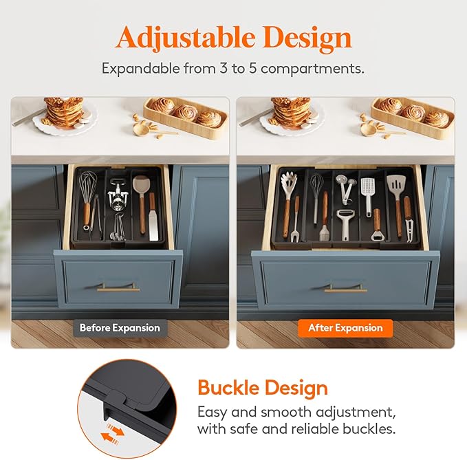 - Expandable and Adjustable: The utensil organizer for kitchen drawers can be expanded from 3 slots to 5 slots, offering extra storage space for utensils. It is adjustable to fit different drawer sizes, ranging from 10.9 to 17.5 inches wide. When folded, it measures 10.9 x 13.7 x 1.5 inches, but expands to 17.5 x 13.7 x 1.5 inches for added space