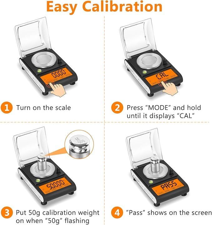 - Calibration & Tare Function: Precision scale is equipped with TARE function can zero the weight of containers or weight pan when you pressing "TARE" button. The PCS function makes it easy to count the number of pieces. 50g calibration weight included to calibrate the scale whenever you need.