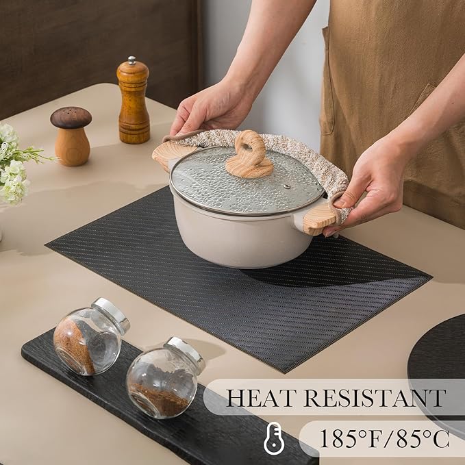 - π·ππππππ π―πππ-πΉππππππππ π·πππππππππ: Our heat-resistant placemats are crafted from durable woven vinyl, withstanding temperatures up to 185Β°F (85Β°C) to shield your table from hot dishes. The woven placemats feature a dense, textured surface that prevents slipping while adding elegant texture to your table setting. Perfect for everyday dining or entertaining guests.