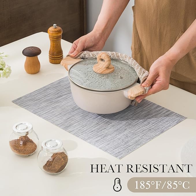 - π·ππππππ π―πππ-πΉππππππππ π·πππππππππ: Our heat-resistant placemats are crafted from durable woven vinyl, withstanding temperatures up to 185Β°F (85Β°C) to shield your table from hot dishes. The woven placemats feature a dense, textured surface that prevents slipping while adding elegant texture to your table setting. Perfect for everyday dining or entertaining guests.