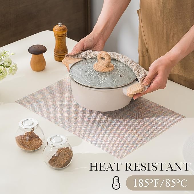 - π·ππππππ π―πππ-πΉππππππππ π·πππππππππ: Our heat-resistant placemats are crafted from durable woven vinyl, withstanding temperatures up to 185Β°F (85Β°C) to shield your table from hot dishes. The woven placemats feature a dense, textured surface that prevents slipping while adding elegant texture to your table setting. Perfect for everyday dining or entertaining guests.