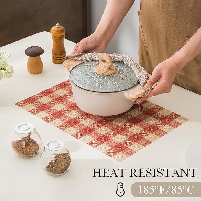 - π·ππππππ π―πππ-πΉππππππππ π·πππππππππ: Our heat-resistant placemats are crafted from durable woven vinyl, withstanding temperatures up to 185Β°F (85Β°C) to shield your table from hot dishes. The woven placemats feature a dense, textured surface that prevents slipping while adding elegant texture to your table setting. Perfect for everyday dining or entertaining guests.