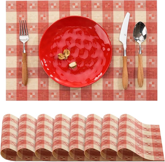 BACKTOEDEN Placemats Set of 8 Heat Resistant Washable Wipeable Placemat Woven Non-Slip Foldable Vinyl/Plastic Place Mats Indoor/Outdoor Mat Kitchen Dining Table Pad, Red Checkered