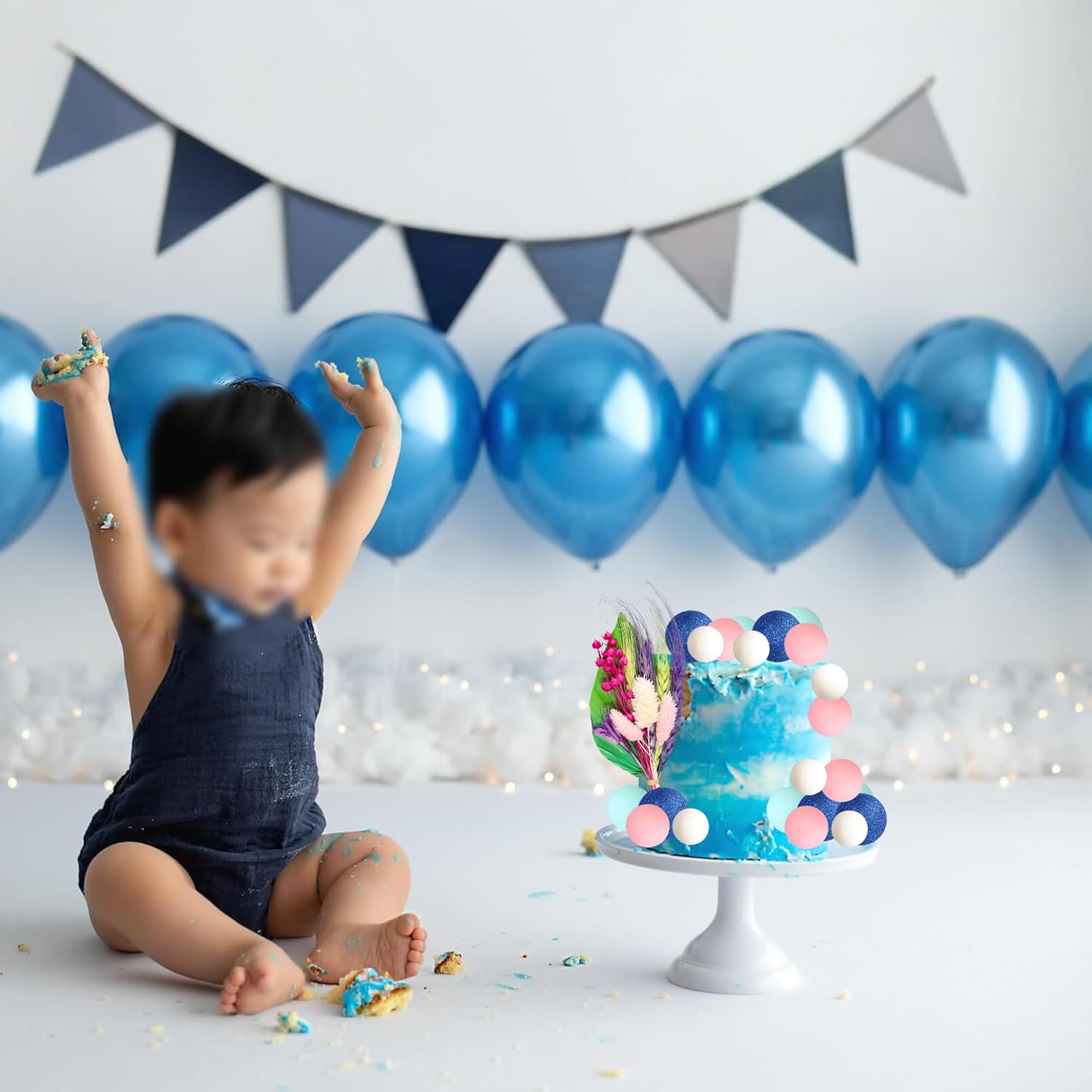 Gyufise 21 Pack Flower Boho Cake Topper Ball Cake Decorations Palm Leaves Plants Cake Decor for Girl Bohemian Princess Theme Wedding Baby Shower Birthday Party Supplies Blue Pink