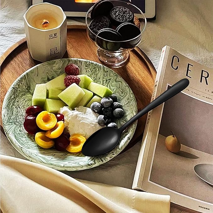 - 【Ergonomic Design and Dishwasher Safe 】The 7.4-inch small spoons are the most comfortable size for daily use. The black silverware set design is ergonomically designed that the appropriate weight and perfect balance to ensure maximum comfort during use that avoids you feel tired. Besides, these spoons are easy to clean and dishwasher safe