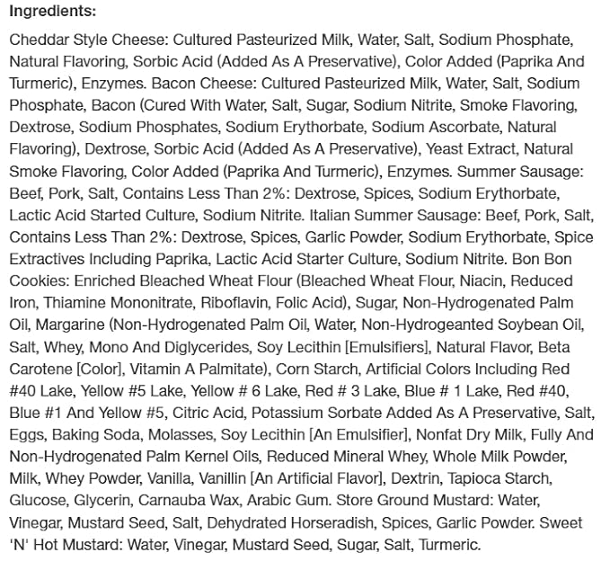 - MEATS AND CHEESES: Features 5 oz summer sausage, 5 oz Italian sausage, 4 oz cheddar style cheese, and 4 oz bacon cheese