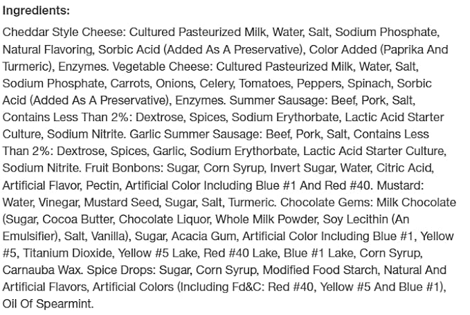 - MEATS AND CHEESES: Features summer sausage, garlic summer sausage, cheddar style cheese, and vegetable cheese