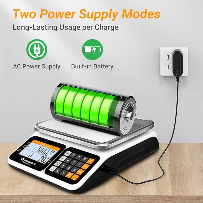- [Dual Power Modes, Indoor & Outdoor Ready] Comes with a built-in rechargeable battery (no need for disposable dry batteries!) + US-plug AC adapter (100-240V wide voltage). Use cordlessly for farmers markets/roadside stalls, or plug in for delis/retail shops. Low-battery alert reminds you to charge promptly; fully charge every 3 months when not in use to extend battery life.