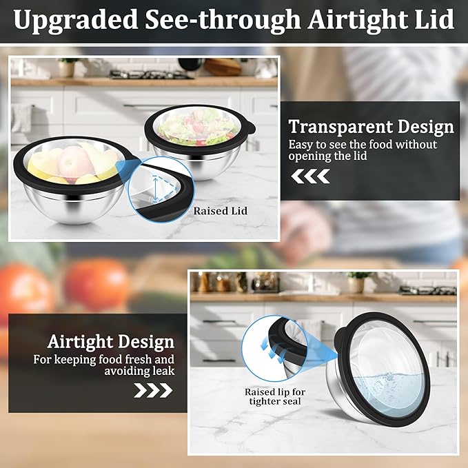 - 【Upgrade Visible Airtight Lid】 Each metal mixing bowl comes with a visible lid, Allows you to easily see the contents without opening it, The lid silicone side is completely wrapped around the bowl and not warp easily, Mixing bowls with lids are great for keep food fresh and avoid spilling and leaking, Raised lid design to provide more capacity for food storage and will not squeeze foods, And the protruding handle makes the lid easier to open