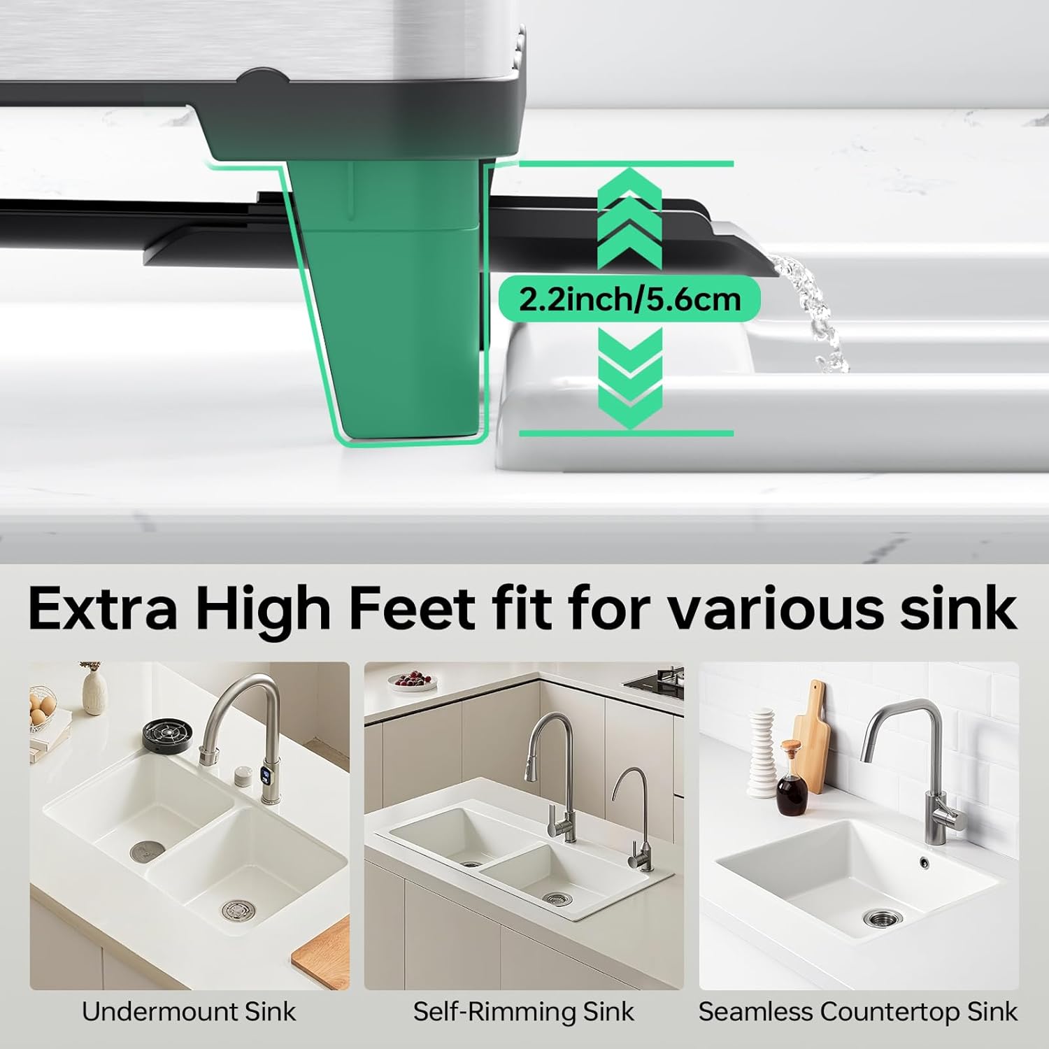 - [8 Feet Stable Support] The extra large dish rack features 8 sturdy legs that evenly distribute weight, preventing tipping and ensuring stability. Additionally, The heighten feet made the expandable dish drying rack perfectly suitable for various sink types (Undermount Sink, Self-Rimming Sink, Seamless, Countertop Sink).Moreover, the height allows water to flow smoothly into the sink, keeping the kitchen dry, tidy, and practical