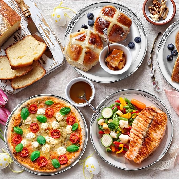 - 【Heavy Duty】Round pizza pan with solid stainless steel construction, Distributing heat evenly and resisting warp and rust, Reusable and sturdy use for a long service life, More economical than disposable pizza trays, they comes with proper weight and feels sturdy when holding in hands
