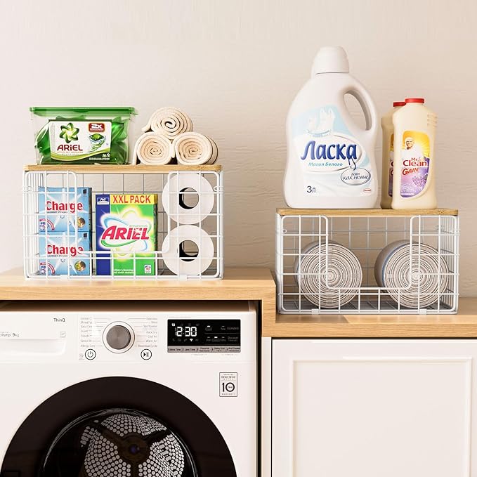 2 Pack Trash Bag Dispenser, Trash Bag Holder with Bamboo Top, Garbage Bag Dispenser, Storage Stackable for Kitchen Laundry Organizers Countertop Organization, White