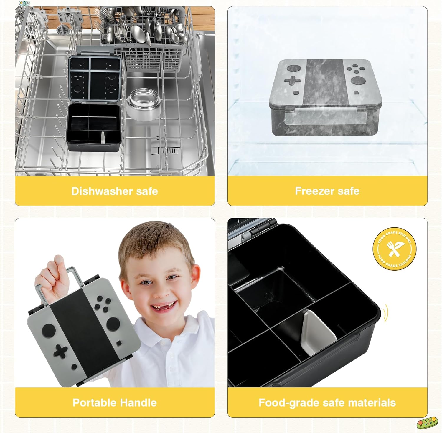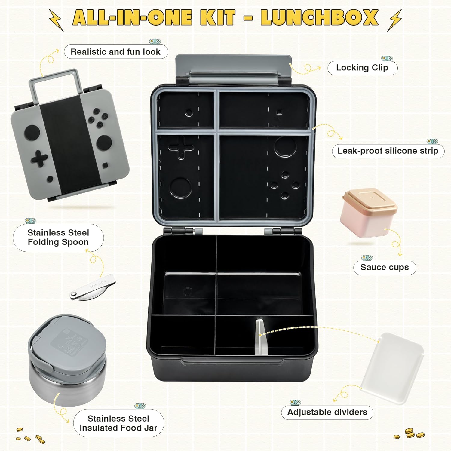 Game Bento Box for Kids, Lunch Box with Thermo(9oz Food Jar), Folding Spoon, Removable Divider & Sauce Cup, Lunch Box Kids for School,Travel, BPA-Free & Realistic Shape(Grey)