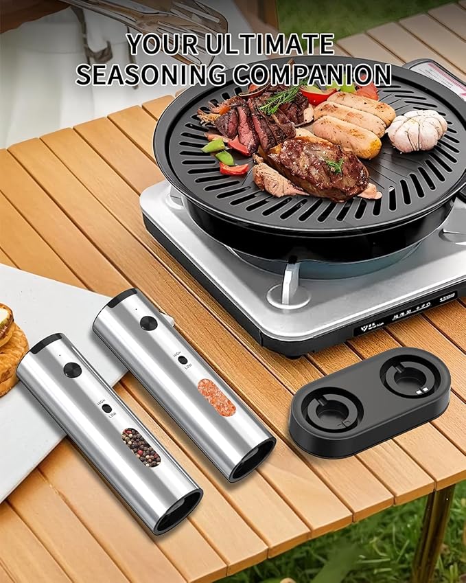 - 【110ML TOP-FILL DESIGN】- Automatic salt and pepper grinder set features a convenient 110ml top-fill design, minimizing refills during cooking. Perfect for daily meals or gatherings, it delivers fresh, finely ground spices instantly at the touch of a button. This compact essential kitchen tool ensures sufficient and fresh seasonings, allowing you to season easily