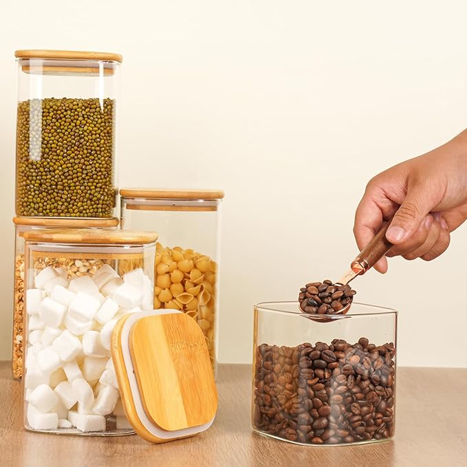 - 【5-Jar Set】: Each package includes 5 pantry storage jars measuring precisely 1* 82 fl oz(3.9" L * 3.9" W*12" H )2*48 fl oz (3.9" L * 3.9" W* 7.4" H)2*24 fl oz(3.9" L * 3.9" W * 4.3" H), perfect for storing spaghetti, pasta, spices, coffee, candies, nuts, dried fruits, and other pantry essentials—whether you're organizing your kitchen, setting up a coffee bar, or just love a clutter-free countertop, these are a must-have: functional, minimal, and straight-up beautiful