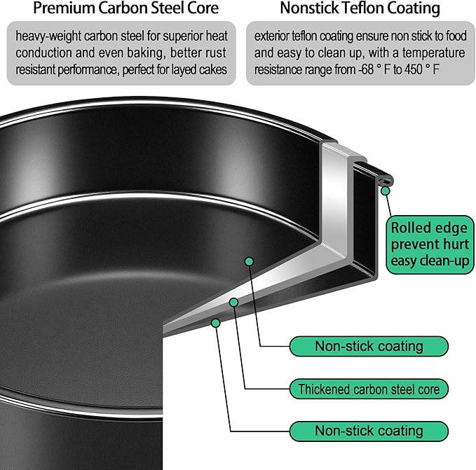 - With 100pcs pre-cut Parchment papers: Our circle cake pan set Includes 100 sheets of pre-cut parchment paper, made from natural wood pulp can be in direct contact with food, anti-staining and high-temperature resistant. Not only does it help you remove the cake perfectly faster, but it also gives you peace of mind that there's no contact with the cake pan. The parchment paper is disposable, so it won’t add to your cleaning burden. It allows you to enjoy every baking moment with family and is perfect for both baking enthusiasts and beginners
