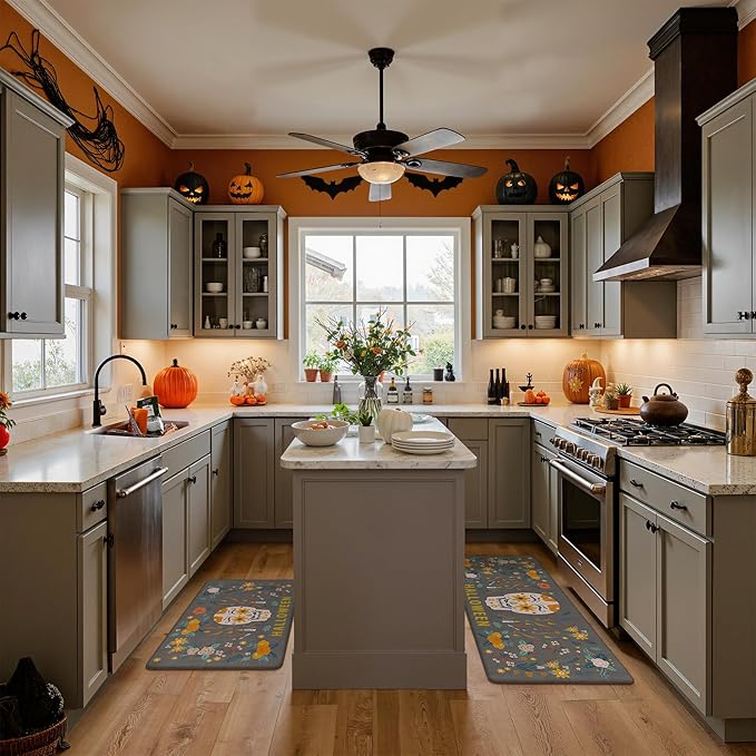 - Halloween Design: GENIMO kitchen mats for floor and Halloween decor are meticulously crafted with an emphasis on quality. Cleverly intertwining pumpkin decor, ghosts, spiders, and bats, it fully show the rich atmosphere of Halloween. These Halloween decorations and kitchen accessories are coordinated in tone, creating an enchanting visual experience.