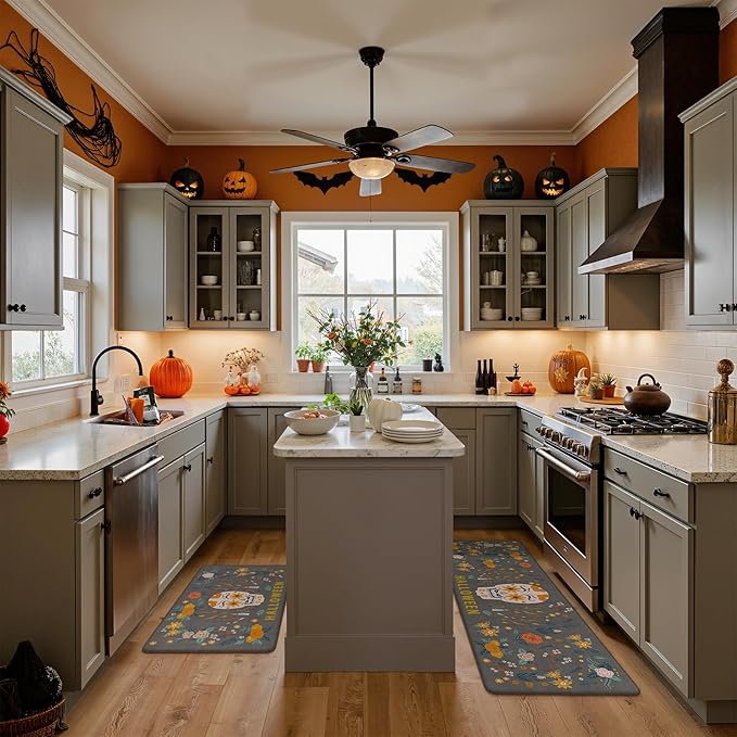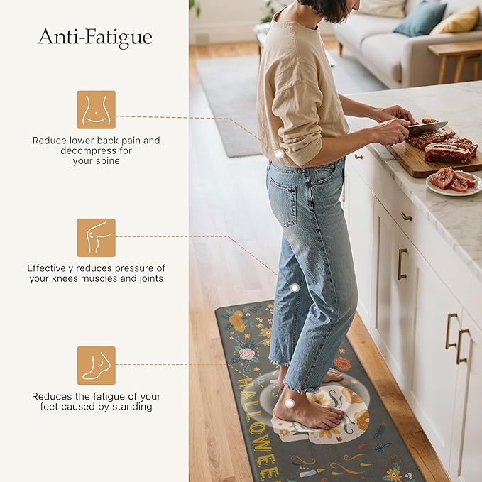 - Halloween Design: GENIMO kitchen mats for floor and Halloween decor are meticulously crafted with an emphasis on quality. Cleverly intertwining pumpkin decor, ghosts, spiders, and bats, it fully show the rich atmosphere of Halloween. These Halloween decorations and kitchen accessories are coordinated in tone, creating an enchanting visual experience.