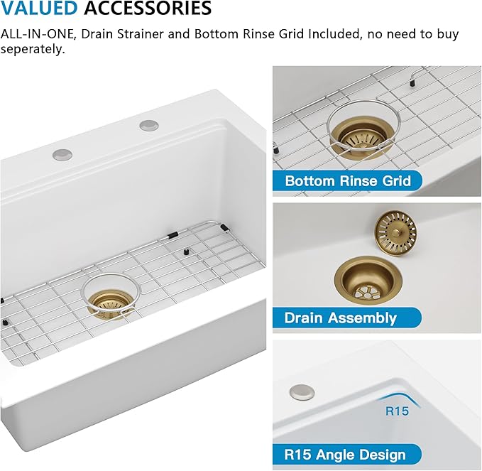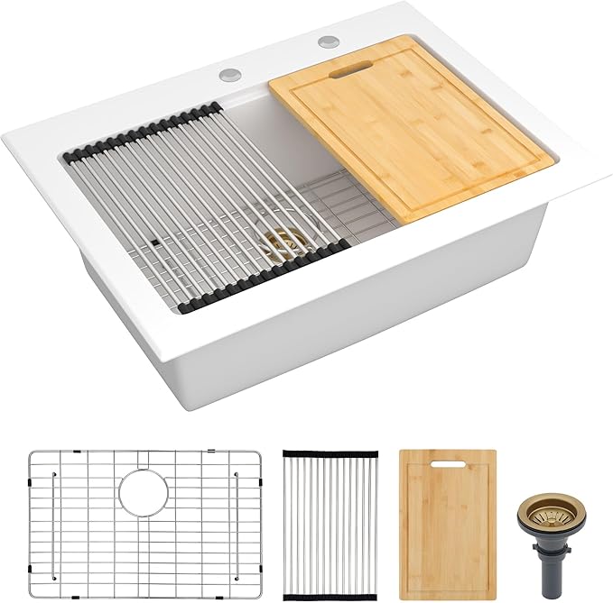 - Sink Set/Installation - Complete package includes a 30 inch white drop in granite composite sink, a bamboo cutting board, a drying rack, a bottom rinse grid, a gold drain assembly, etc.|Cutout Size: 29.2"(width) x 21.2"(depth)|Minimum Cabinet Size: 33 inch. Easy to install topmount granite sink drop in. Fulorni offers a 3-month effortless return and exchange policy for the drop white kitchen sink, with a support team always ready to help you.