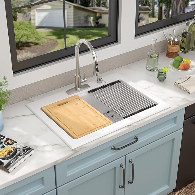 - 30 inch drop in workstation granite kitchen sink is made of premium quartz composite material (natural quartz crystals and acrylic resin, etc.) with a hard, smooth, compact and non-porous finish as real stone, highly resistant to chips, fades and scratches. Classic quartz pure white color definitely makes it the perfect indispensable addition to your kitchen.