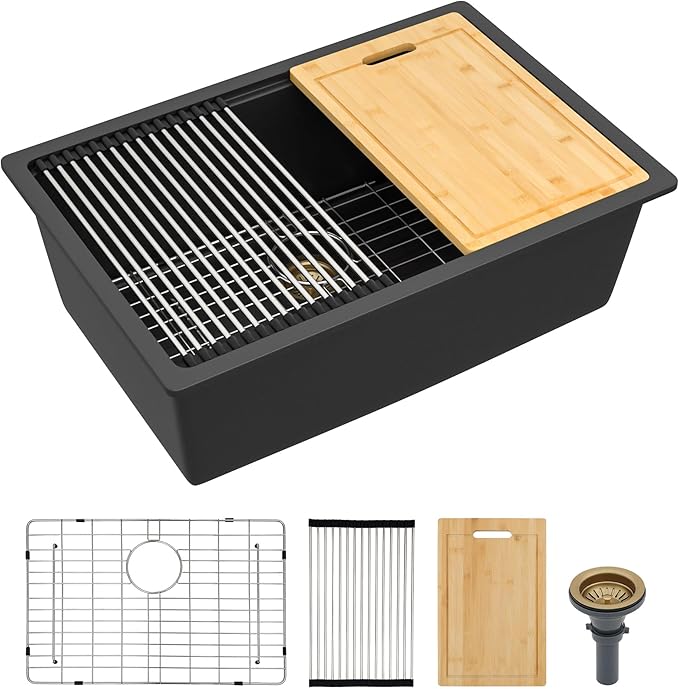 - 〓 Sink Set/Installation - Complete package includes a 28 inch black granite composite kitchen sink workstation, a bamboo cutting board, a roll up drying rack, a bottom rinse grid, a gold drain assembly.|Cutout Size: 26"(width) x 17"(depth)|Minimum Cabinet Size: 31 inch. Undermount/Under Counter installation creates a seamless transition from countertop to sink with no exposed edges for a more compact, stylish look.