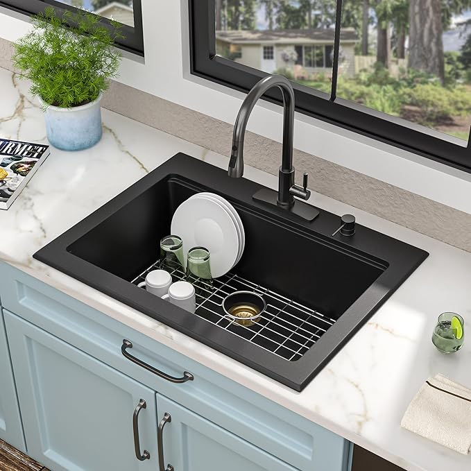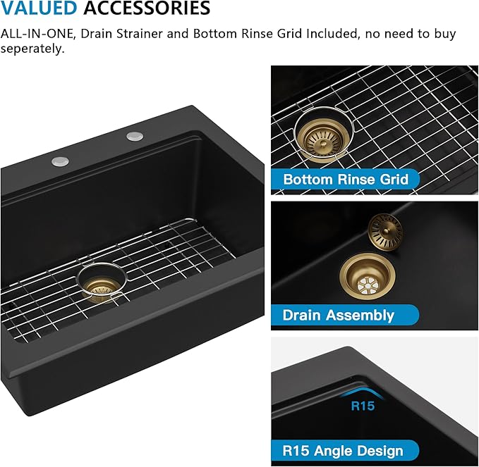 - 〓 30 inch drop in workstation granite kitchen sink is made of premium quartz composite material (natural quartz crystals and acrylic resin, etc.) with a hard, smooth, compact and non-porous finish as real stone, highly resistant to chips, fades and scratches, easy to clean and maintain. Classic quartz matte black color definitely makes it the perfect indispensable addition to your kitchen.