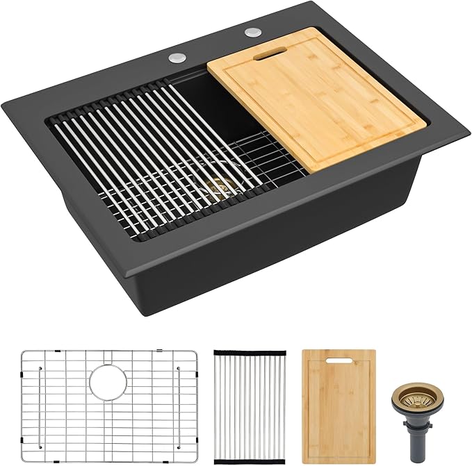 - 〓 Sink Set/Installation - Complete package includes a 30 inch black drop in granite composite sink workstation, a bamboo cutting board, a roll up drying rack, a bottom rinse grid, a gold drain assembly and more.|Cutout Size: 29.2"(width) x 21.2"(depth)|Minimum Cabinet Size: 33 inch. Reserved 2 holes for soap dispenser or water purifier faucet. Easy to install topmount granite sink drop in. | If any quality issues, please reach out to us, We're always ready to help you - Fulorni Service.