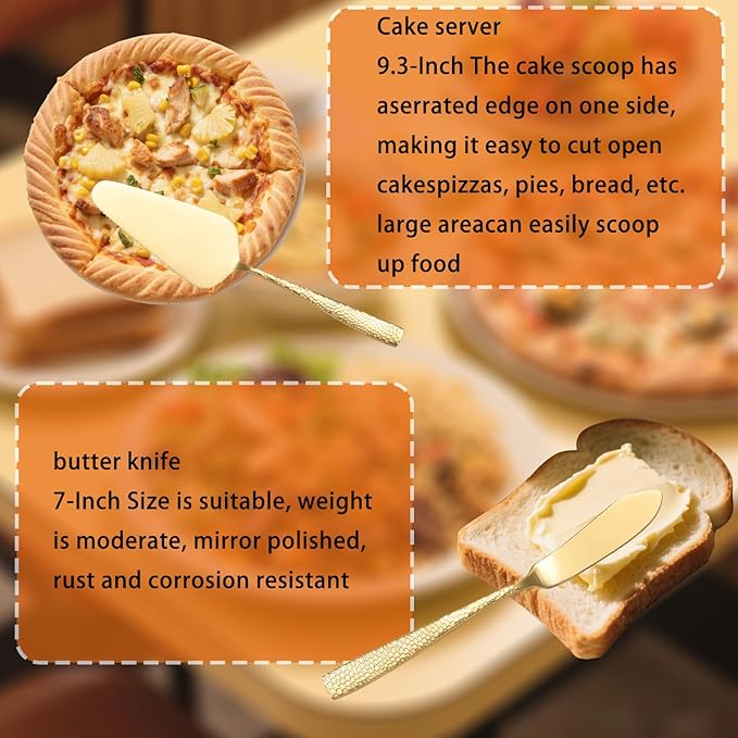 - 【5 Piece Serving Utensils Set】: Serving spoons x1 (9 inches) , slotted spoons x1 (9 inches) , serving fork x1 (9 inches) , cake server x1 (9.3 inches) , butter knife x1 (7 inches)