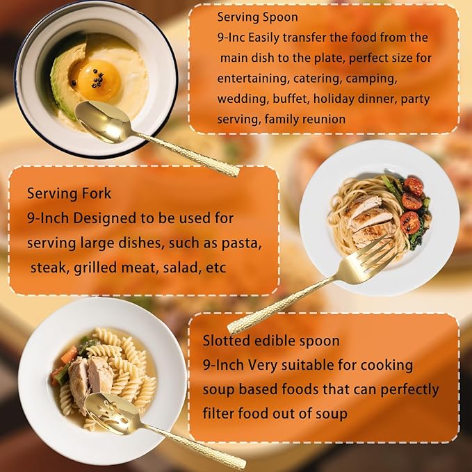 Large Hostess Serving Utensils Set, Stainless Steel Heavy Duty Hammered Serving spoons, Slotted Spoons, Serving Fork, Cake Server, Butter Knife, Dishwasher Safe (Gold)