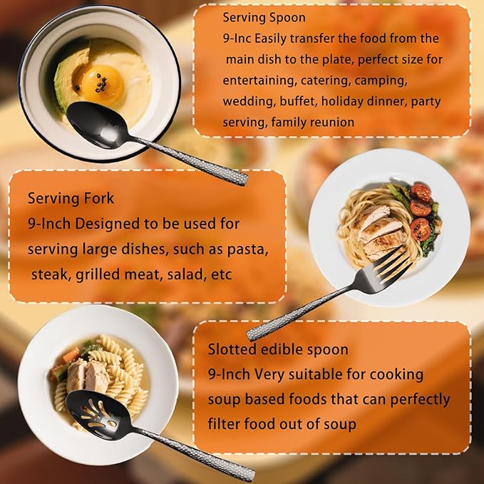 Large Hostess Serving Utensils Set, Stainless Steel Heavy Duty Hammered Serving spoons, Slotted Spoons, Serving Fork, Cake Server, Butter Knife, Dishwasher Safe(Black)
