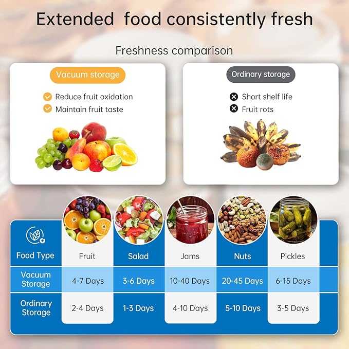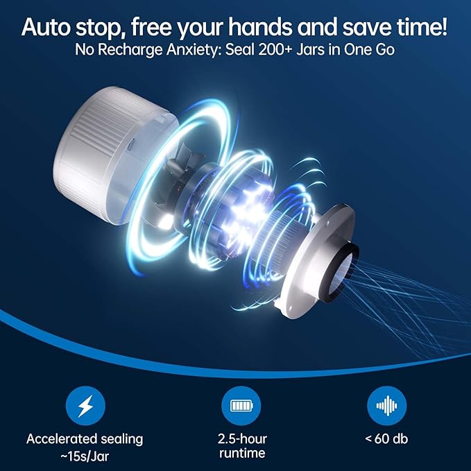 - 【Rapid Vacuum Sealing & Extended Freshness】 This electric jar sealer does vacuum sealing for canning glass jars in 15s. With our 3-layer gasket canning jar lids, this canning jar sealer keeps food fresh 3x longer—ideal for meal prep, coffee beans, perishables, pet food