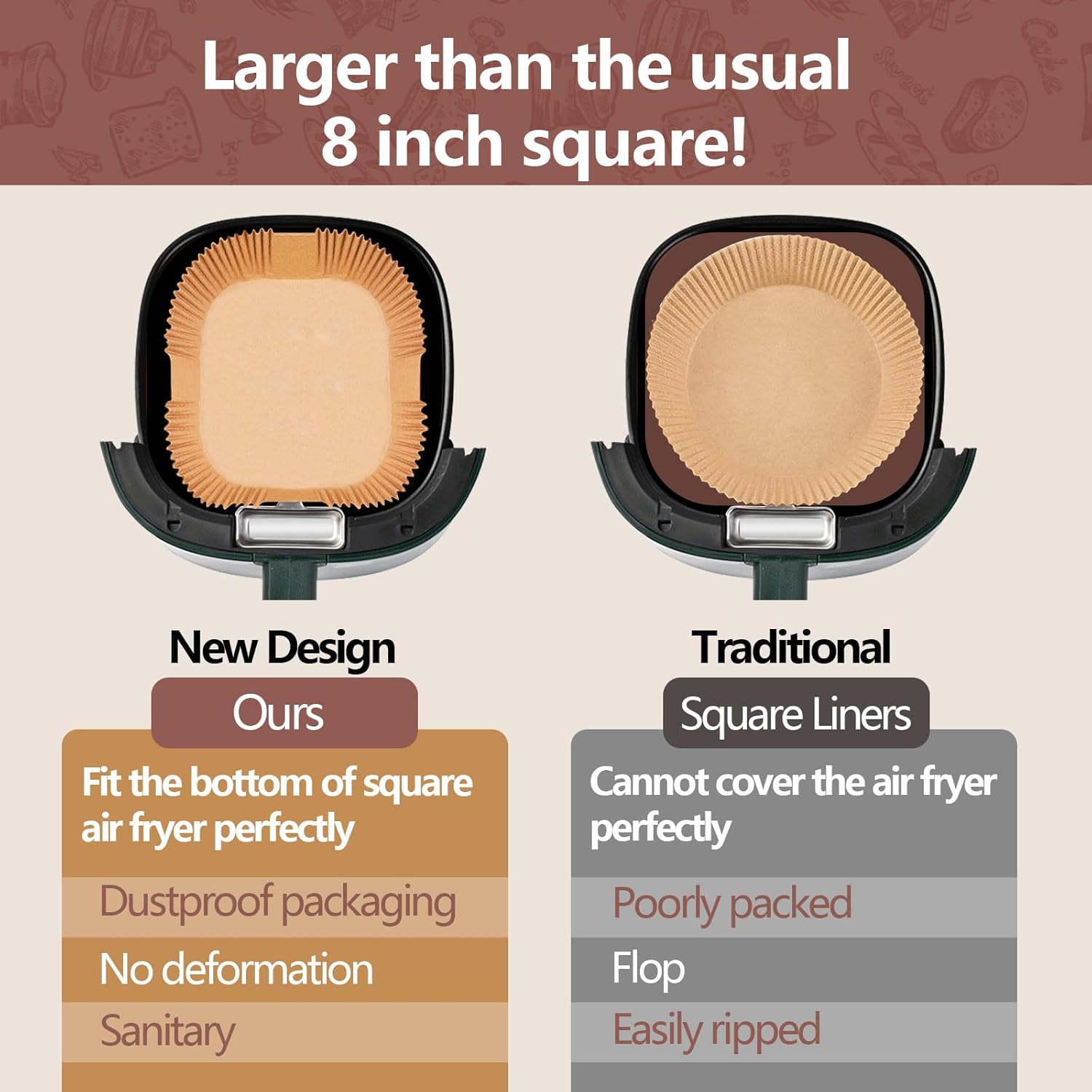 - 【Keep your air fryer spotless】Our 7.5-inch square paper liners are designed to keep your 2-5 QT air fryer clean and free from food residue. They make cleaning a breeze and leave your fryer looking as good as new