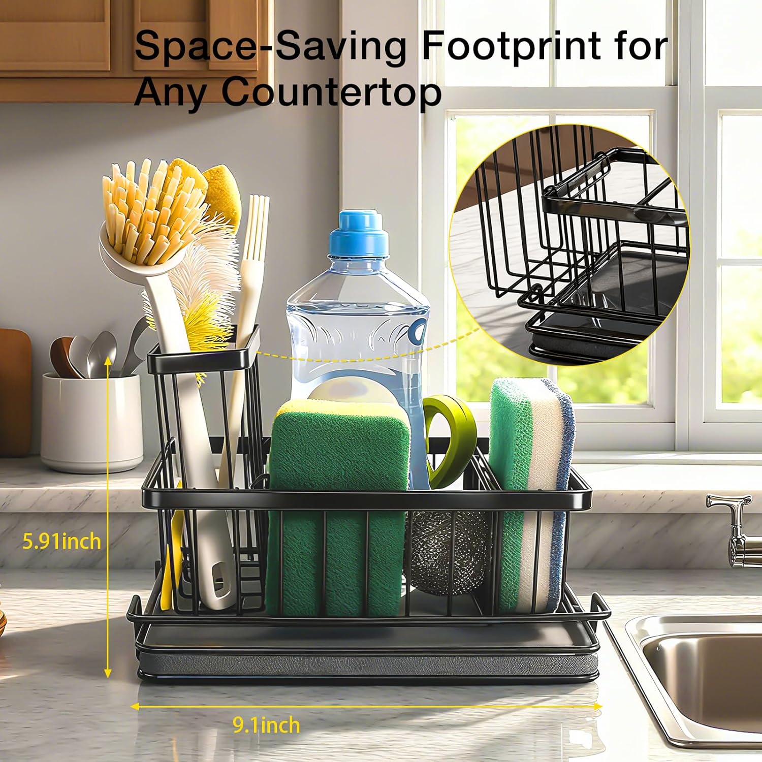 - Scientifically Divided Multi-Function Storage: Features a built-in three-in-one compartment design for flexible storage solutions: a brush holder, a large-capacity bottle/can zone (holds 2-3 cleaning bottles), and a dedicated sponge/scouring pad area—keeping everything organized.
