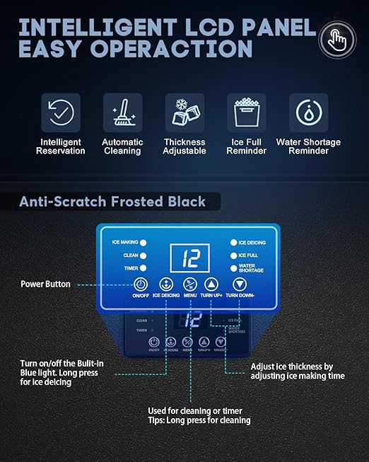 - 【Smart LCD Control Panel with Multi-Functions】Enjoy full control with an intuitive LCD display, offering one-click operation for: 24-hour、timer reservation、Automatic self-cleaning 、De-icing function、Built-in blue light, Malfunction alert. Adjust ice-making time (+/-) to control cube thickness and tailor ice to your needs.