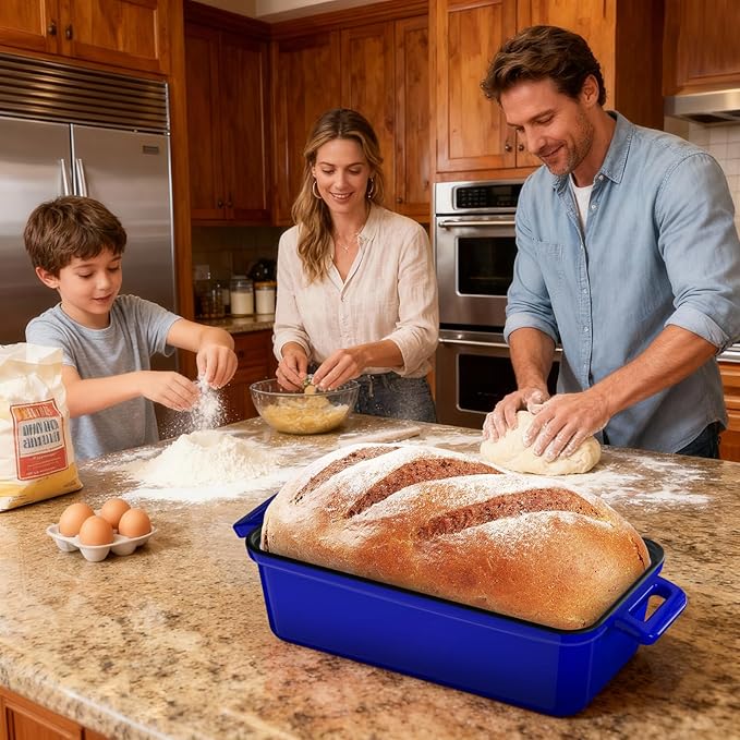 - Superior Heat Retention for Even Baking: Crafted from thick cast iron, this versatile 2-in-1 design lets you use each piece separately as open baking pans or stack together to create a steam-sealed Dutch oven effect. Even heat distribution ensures perfectly baked loaves—no burnt edges, no underbaked centers. Oven-safe to 500°F with sturdy handles for safe handling.