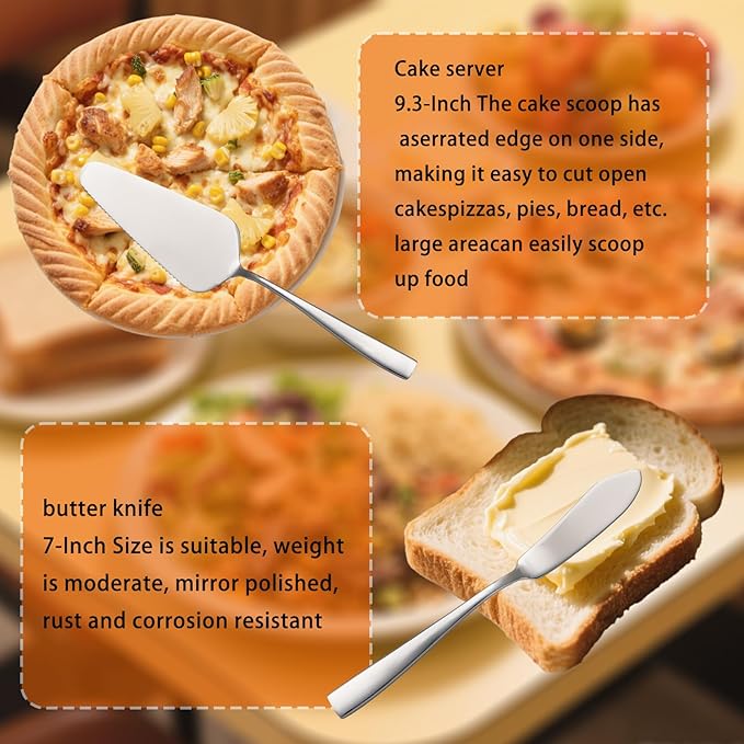 - 5 Piece Serving Utensils Set: Serving spoons x1 (9 inches) , slotted spoons x1 (9 inches) , serving fork x1 (9 inches) , cake server x1 (9.3 inches) , butter knife x1 (7 inches)
