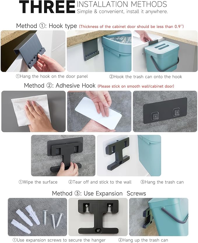 - [Under Sink / Wall Mount Trash Can] Hanging trash is an excellent choice for your daily activities. You can use it while you cook and then store it under the sink. Fit for most cabinet doors, pantry doors, cupboards, under sinks, walls, and countertops.