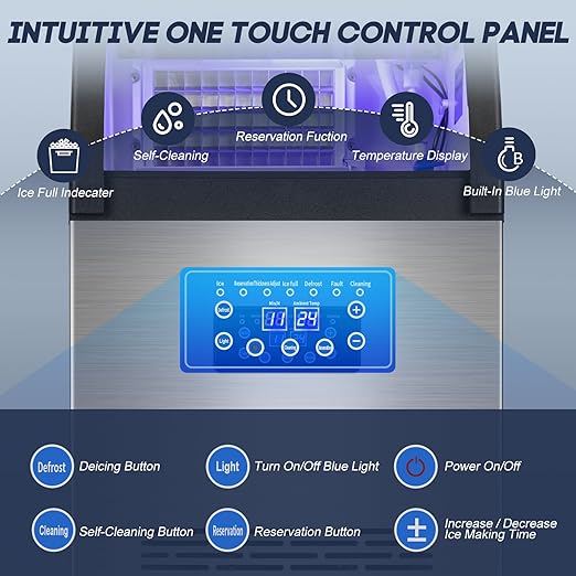 - 【Smart LCD touch panel】 - The multi-function smart control panel supports one-button operation, easily realizing 24-hour scheduled ice making, automatic cleaning, fault reminder, defrosting function and built-in blue light lighting, which is convenient to operate, worry-free and labor-saving.