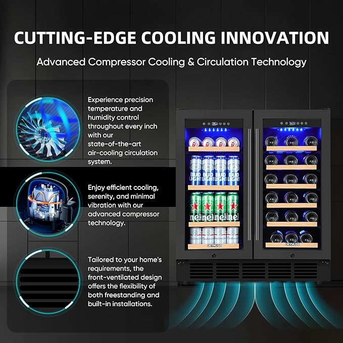 - SPACE-SAVING, SLEEK DESIGN - Our dual-zone wine and beverage refrigerator offers placement flexibility. Measuring 34.25"(H) × 30.31"(W) × 23.03"(D), it fits seamlessly into a variety of spaces. Its front-vented design allows it to be built into the countertop, saving valuable floor space and creating a sleek, integrated look for your kitchen or bar. Alternatively, you can choose to use it as a freestanding wine fridge, giving you the freedom to place it wherever you need it most. Whether you're looking to maximize space in a small apartment or create a dedicated beverage area in a larger home, this beverage refrigerator's flexible installation options are ideal