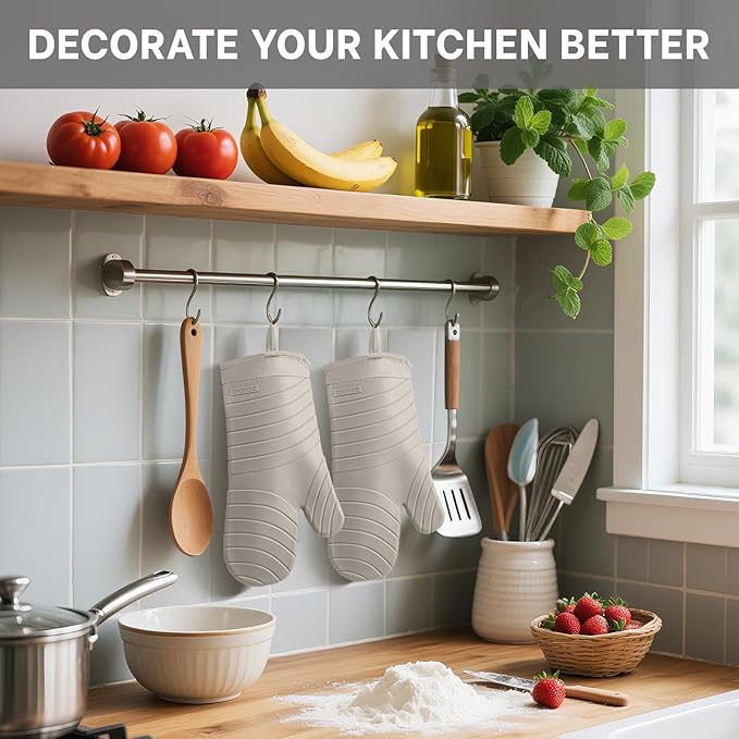 - Easy to Clean, Easy to Store: Made from stain-resistant silicone, these oven mitts repel oil, grease, and food splatters, just simply wipe or rinse clean it in seconds! The built-in hanging loops keeps your mitts easy for display as a stylish kitchen decor on hooks or drawer pulls