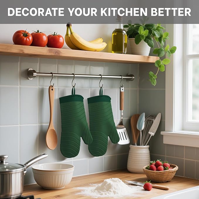 - Easy to Clean, Easy to Store: Made from stain-resistant silicone, these oven mitts repel oil, grease and food splatters, just simply wipe or rinse clean it in seconds! The built-in hanging loops keeps your mitts easy for display as a stylish kitchen decor on hooks or drawer pulls