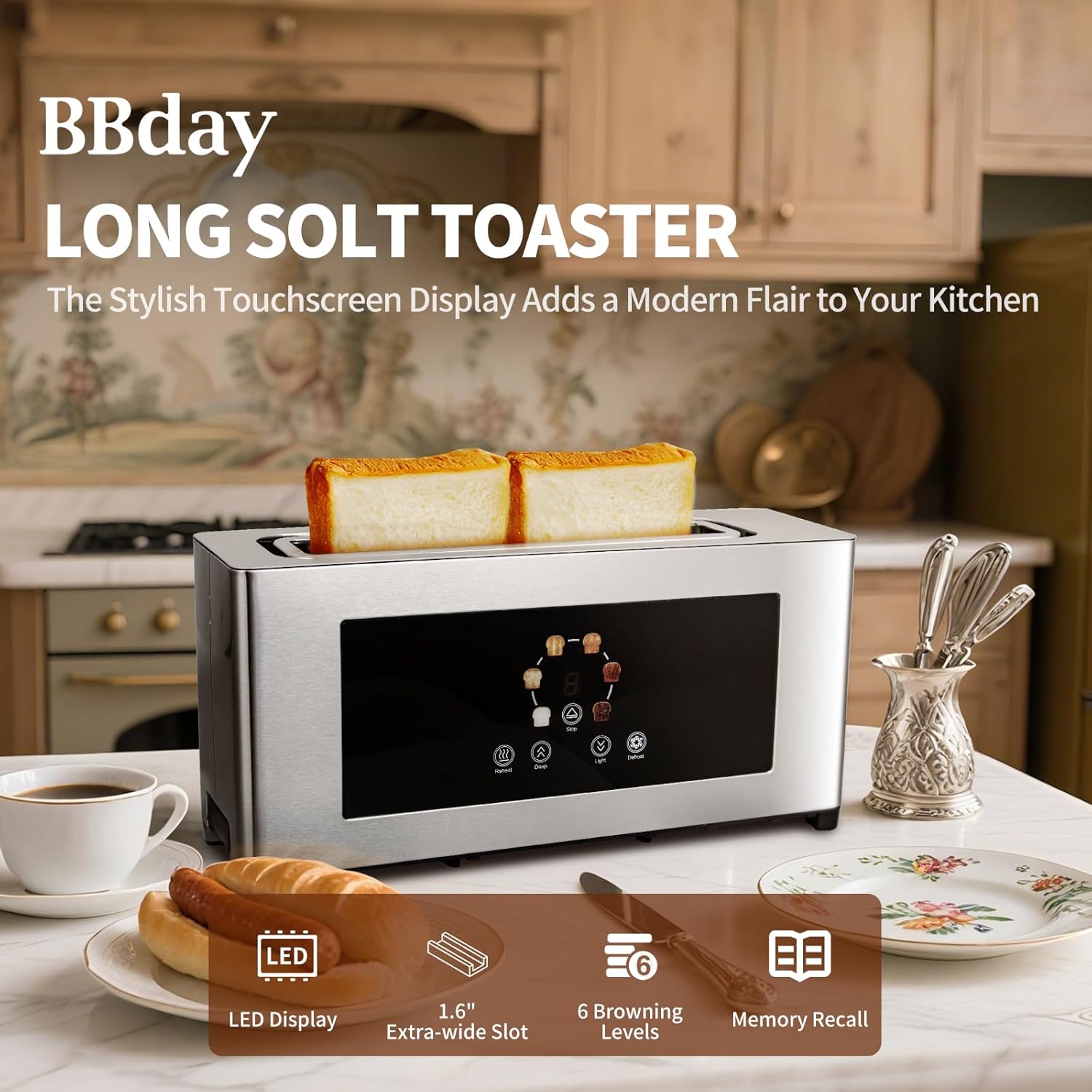 Touch Screen Toaster with LCD Display, Slim Toaster 2 Slice - Long 10" Slot for Baguettes & Extra Wide 1.6" Slot, 6 Browning Levels, 1200W, Space Saving